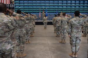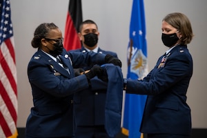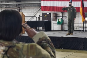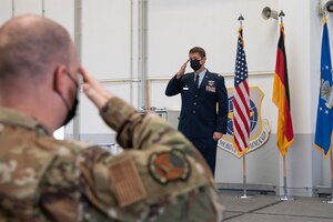 U.S. Air Force Col. David Epperson, 52nd Fighter Wing commander (left), passes the medical group guidon to U.S. Air Force Col. Peter French, the new 52nd Medical Group commander, during the 52nd MDG change of command ceremony June 30, 2021, on Spangdahlem Air Base, Germany. During the ceremony, U.S.