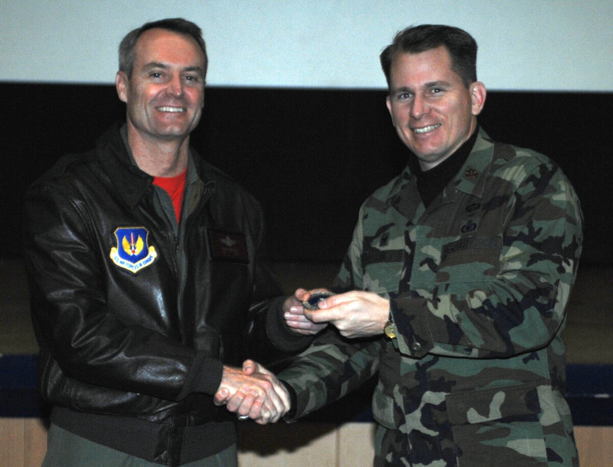 SPANGDAHLEM AIR BASE, Germany –Col. Darryl Roberson, 52nd Fighter Wing commander, returns the 52nd Security Forces Saber Choices coin to Maj. Paul Cairney, the squadron commander. The coin signifies that the unit has gone 52 days without any driving while under the influence or alcohol related incidents. (U.S. Air Force photo/Airman 1st Class Jennifer Calhoun)