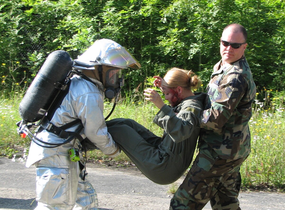 SPANGDAHLEM AIR BASE, Germany – Harry Heidgen, 52nd Civil Engineer Squadron firefighter, treats Airman Basic Lindsey Keene, 52nd Services Squadron, who played an injured Airman during a simulated C-17 crash at Oberweis near Bitburg Annex. The emergency management exercise was designed to test the 52nd Fighter Wing emergency response capability. (U.S. Air Force photo/Master Sgt. George King)