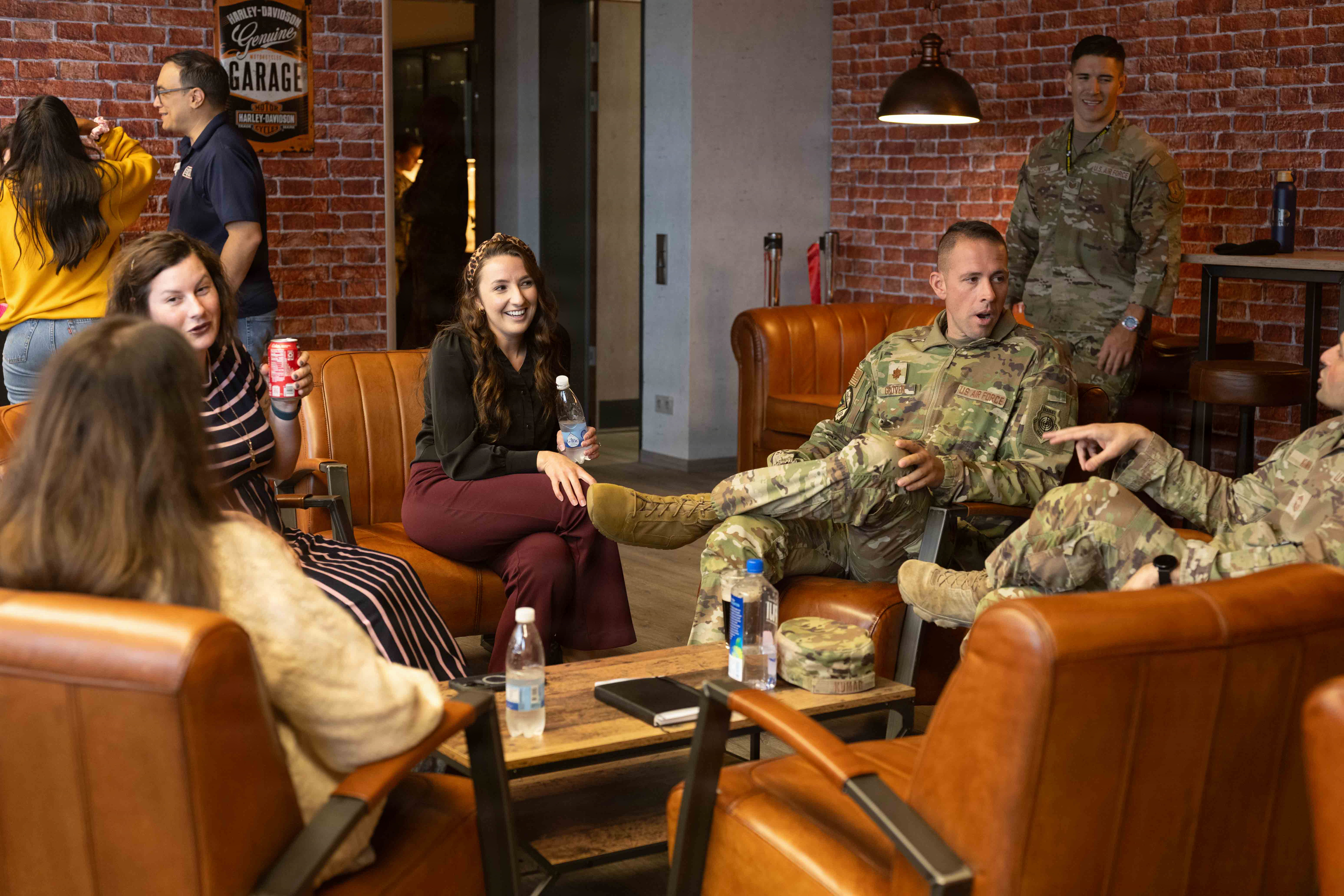 Members assigned to the 52nd Fighter Wing celebrate the re-opening of the Brick House Lounge at Spangdahlem Air Base, Germany, Sept. 30, 2025. The Brick House lounge is available for unit or group events and provides an accessible setting for Airmen and civilians to gather and build connections. (U.S. Air Force photo by Senior Airman Darius Frazier)