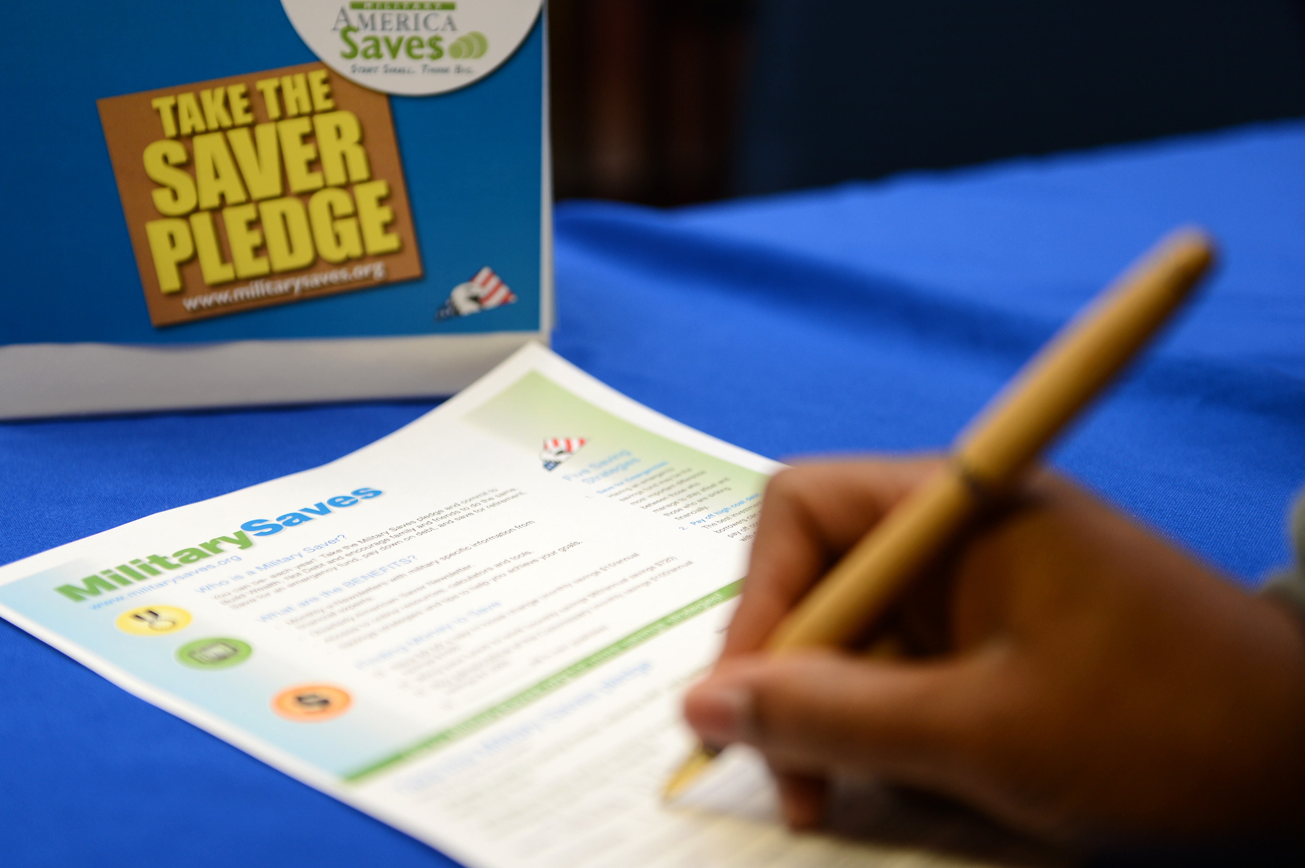 SPANGDAHLEM AIR BASE, Germany -- Master Sgt. Talisha Bruce, from Topeka, Kansas, 52nd Communications Squadron NCO in charge of policies and evaluations, signs up for a money saving pledge while at the Military Saves Campaign information fair at the Wilkommen Center, Feb. 25, 2013. The Military Saves Campaign kicks off February 25, and runs through March 2. (U.S. Air Force photo by Tech. Sgt. Jonathan Pomeroy/Released)