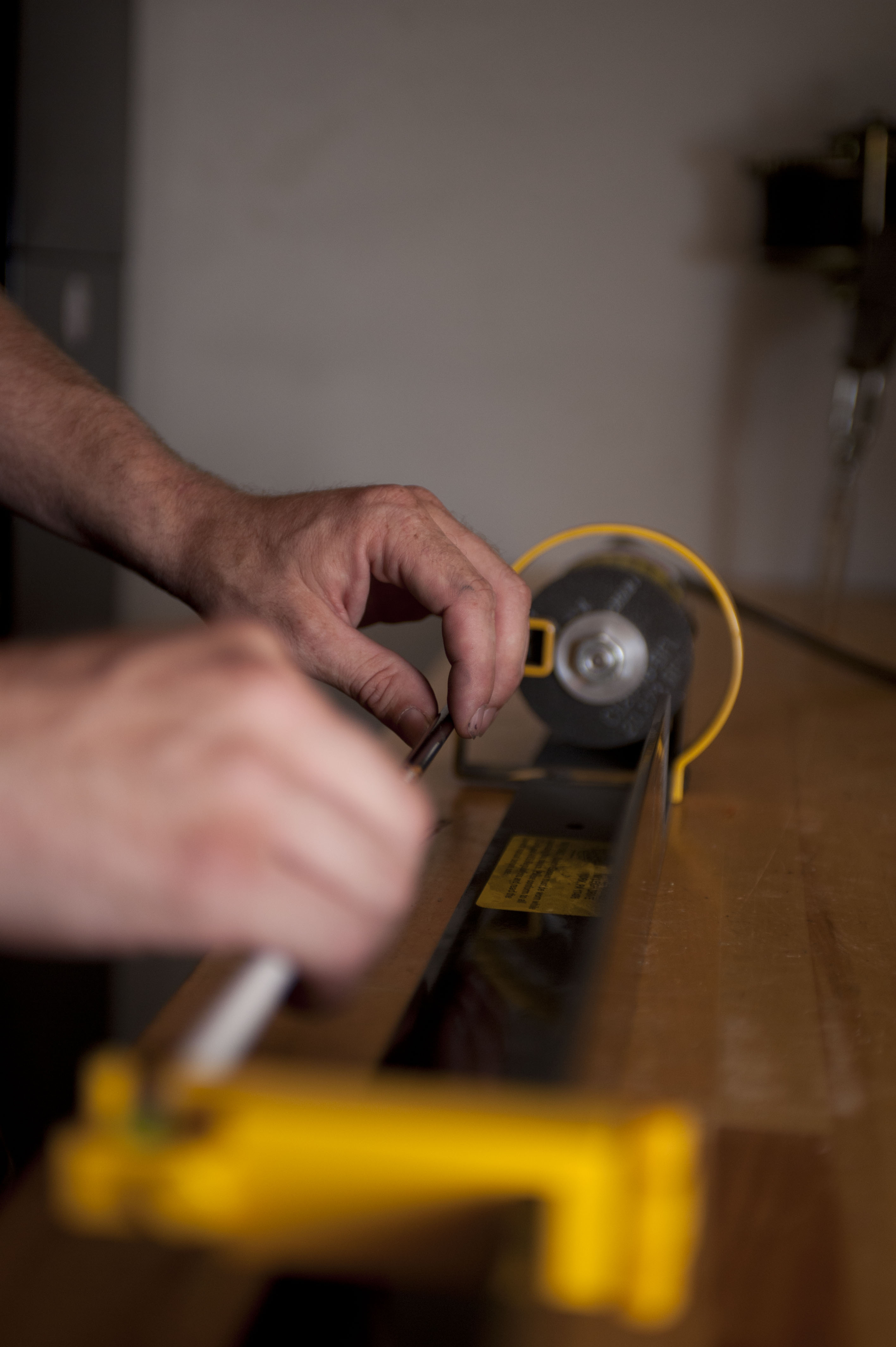SPANGDAHLEM AIR BASE, Germany -- Tech. Sgt. Kevin Phillips, 52nd Equipment Maintenance Squadron aircraft structural maintainer, cuts an arrow in the archery range in his attic July 26 here. Phillips is an amateur archer who is competing to become a professional at the European 5 Nations Field Series tournament in Ash, Luxembourg, this year. He trains with local archers with whom he builds partnerships through exchanging archery techniques. (U.S. Air Force photo by Senior Airman Natasha Stannard/Released)