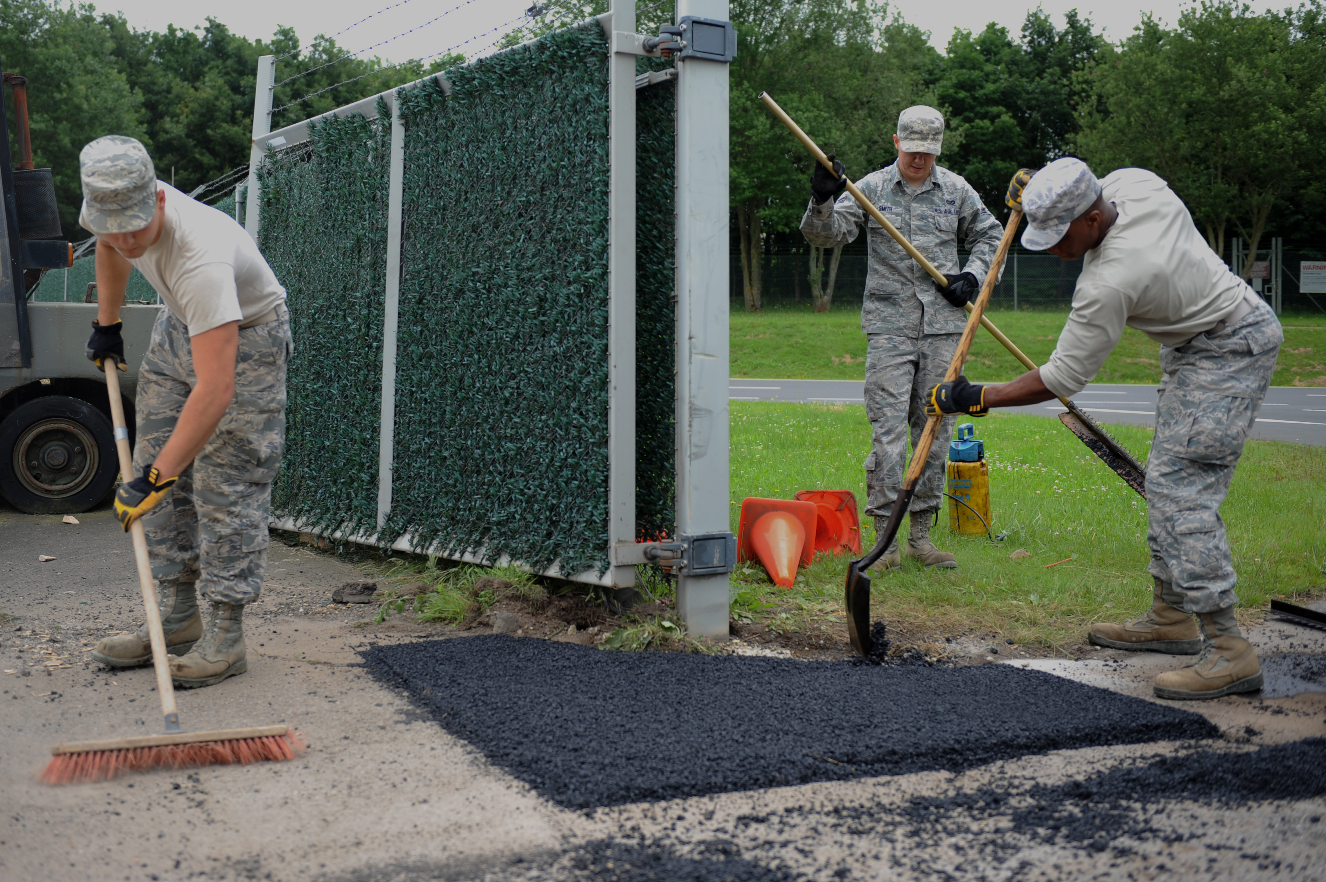 SPANGDAHLEM AIR BASE, Germany – Airmen from the 52nd Civil Engineer Squadron Pavement and Equipment Flight fill a pothole with asphalt at the recycling center parking lot here June 29. The 52nd CES pavement and heavy equipment operators construct, maintain and repair concrete and asphalt runways, aircraft parking aprons and roads, security fencing, and drainage structures. The operators maintain and develop the base’s infrastructure to continually modernize its functionality and appearance. (U.S. Air Force photo by Airman 1st Class M. Blaiser Fredericks/Released)
