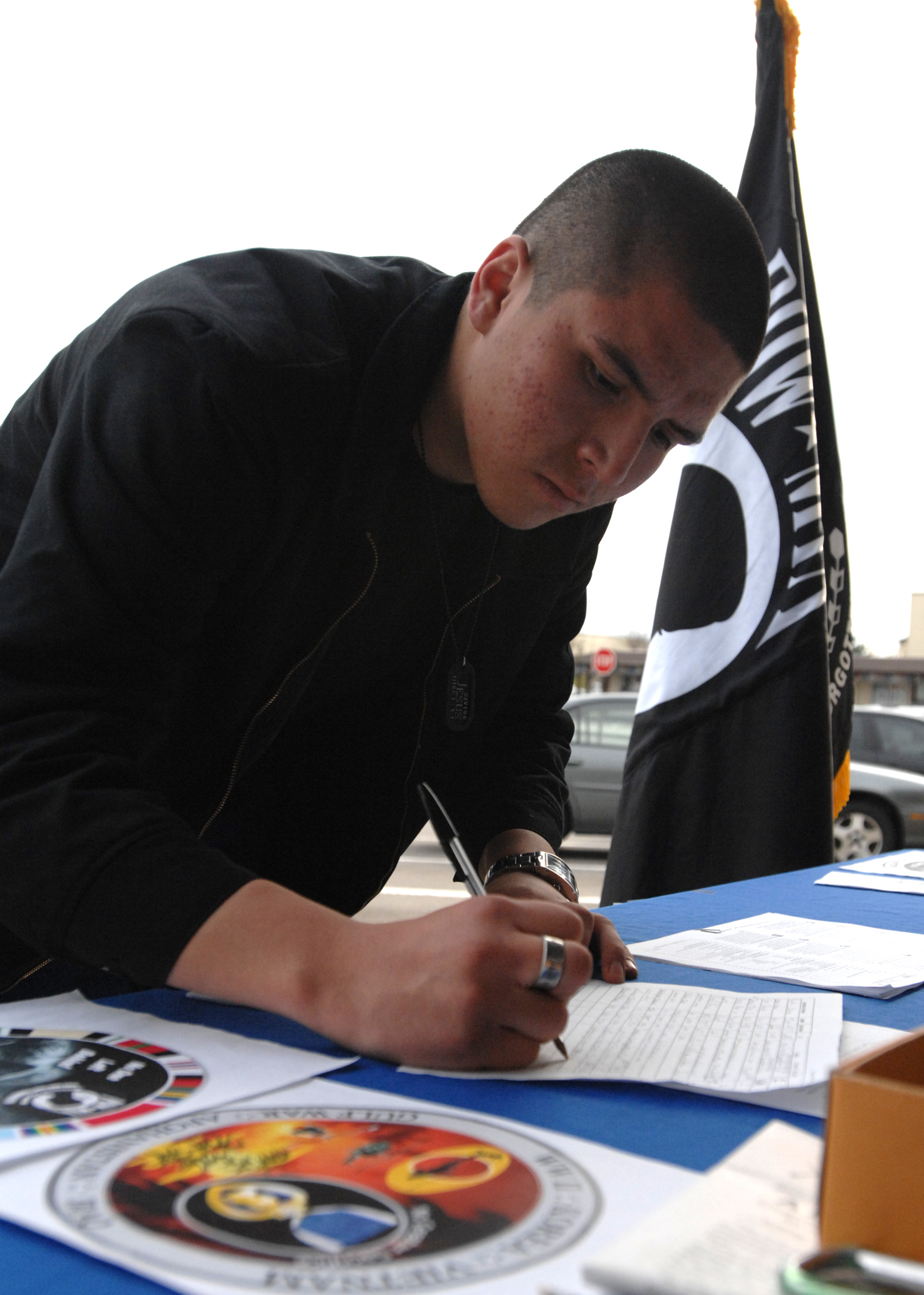 SPANGDAHLEM AIR BASE, Germany -- Airman 1st Class Anthony Alvarez, 52nd Civil Engineer Squadron, purchases a Prisoner of War coin March 13, 2009. The Air Force Sergeants Association sponsored the fundraiser to raise money for POW awareness. (U.S. Air Force photo by Senior Airman Jenifer H. Calhoun)