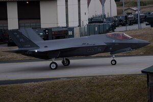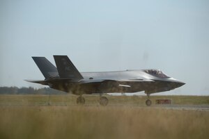 A U.S. Air Force F-15E Strike Eagle, assigned to the 4th Fighter Wing, Seymour Johnson Air Force Base, North Carolina, takes off the flightline during Operation Rapid Forge at Spangdahlem Air Base, Germany, July 25, 2019. Rapid Forge aircraft are forward deploying to bases in the territory of NATO