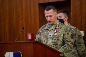 U.S. Air Force Lt. Col. Adam Baker, outgoing 52nd Force Support Squadron commander, addresses the crowd at the 52nd FSS change of command ceremony July 6, 2021, on Spangdahlem Air Base, Germany. During the ceremony, Baker relinquished command to U.S. Air Force Maj. Ingrid Muniz. (U.S. Air Force